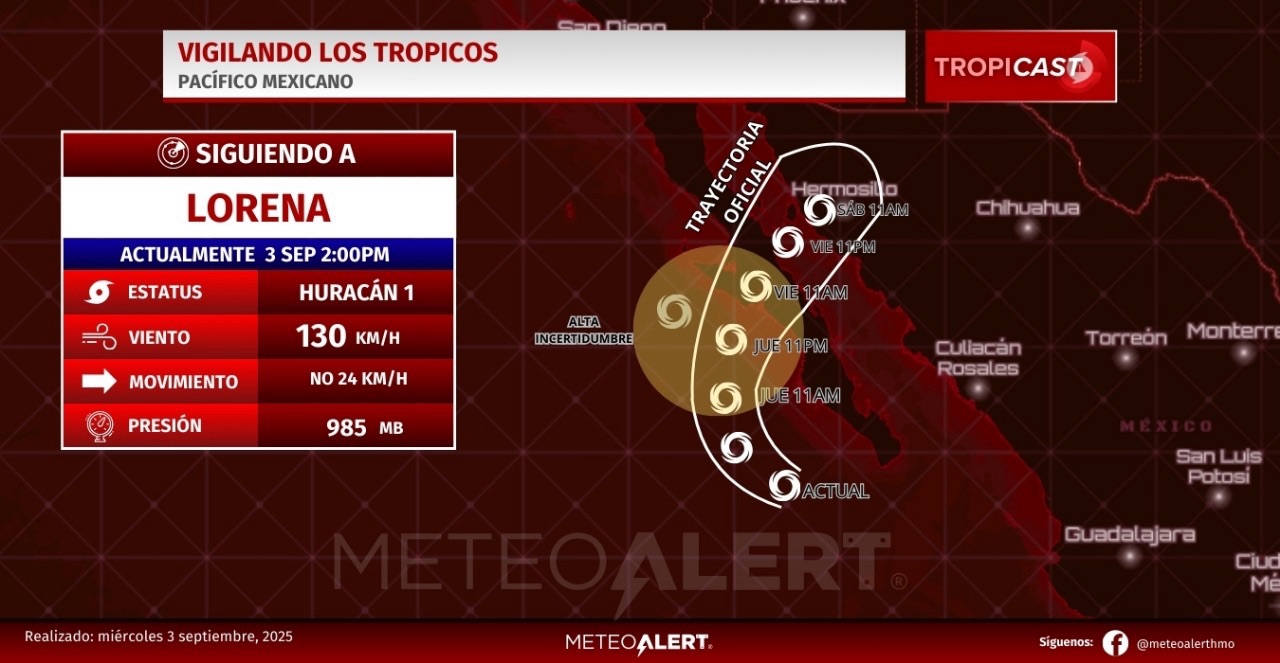 El huracán Lorena se mantiene como categoría 1, con un núcleo compacto que limita el alcance de sus vientos aunque favorece una posible intensificación. Actualmente avanza paralelo a la costa de Baja California Sur, donde permanece bajo condiciones propicias para mantenerse o reforzarse ligeramente .